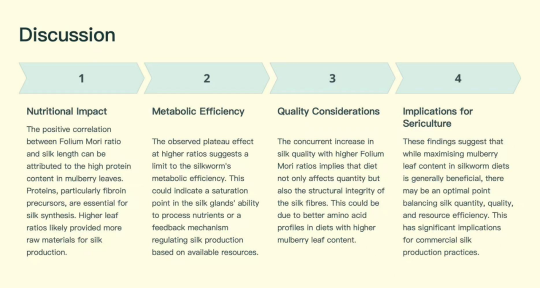 結(jié)論:發(fā)現(xiàn)適當(dāng)?shù)纳H~比例能顯著提高蠶絲的長度和質(zhì)量,為蠶絲產(chǎn)業(yè)提供了優(yōu)化飼養(yǎng)條件的依據(jù)。